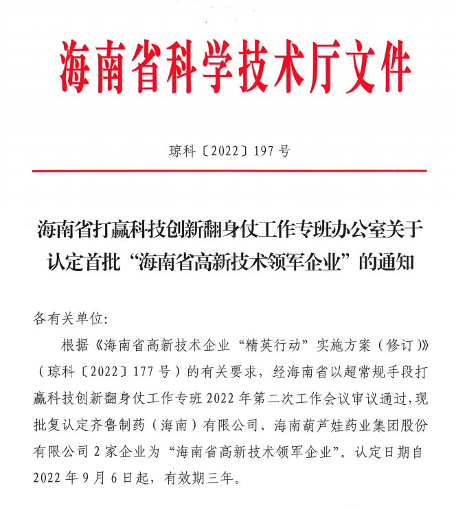 近日,海南省科学技术厅发布的《海南省打赢科技创新翻身仗工作专班办公室关于认定首批“海南省高新技术领军企业”的通知》中显示,批复认定海南伟德国际1946药业集团股份有限公司等2家企业为“海南省高新技术领军企业”。认定日期自2022年9月6日起,有效期三年。