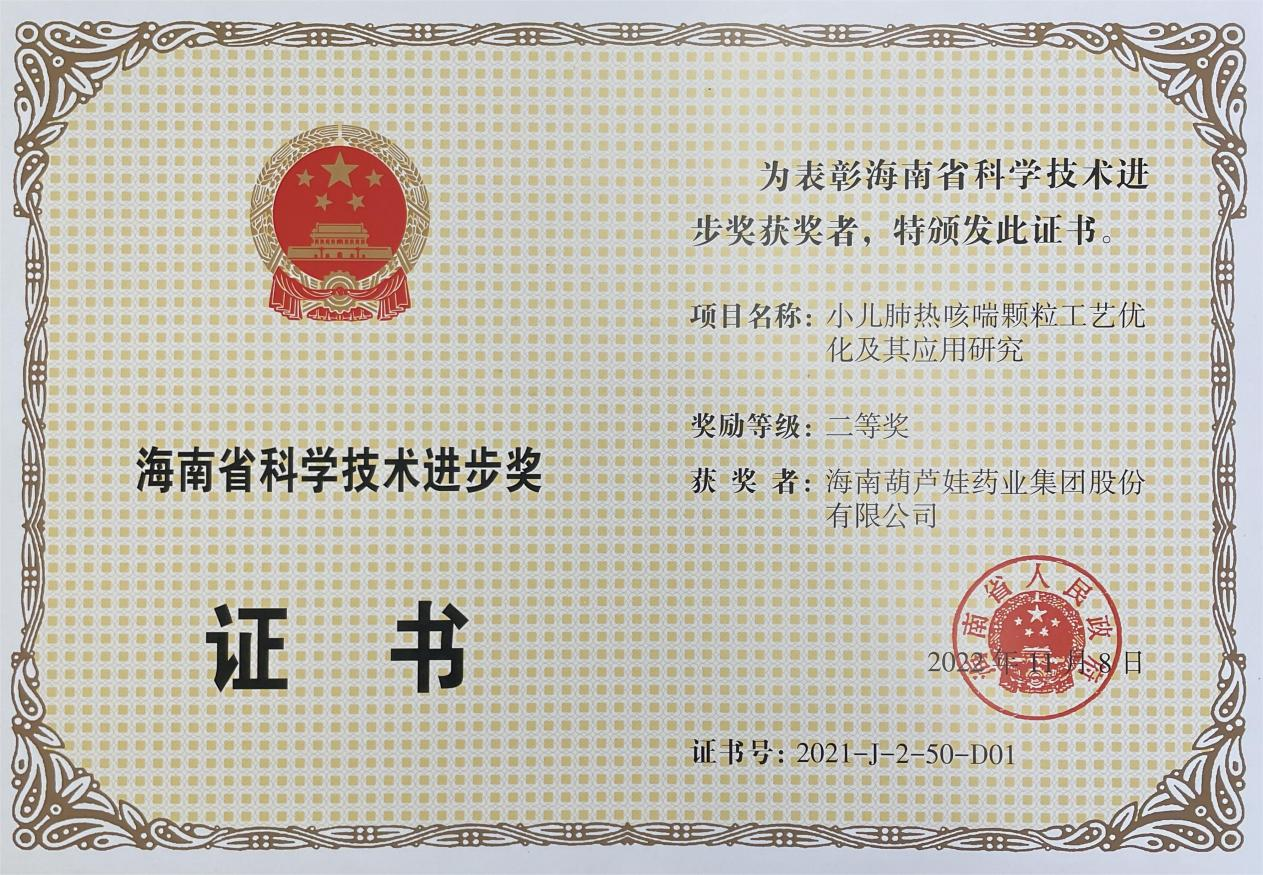 为此,小儿肺热咳喘颗粒的制备方法获得了第二十一届中国专利优秀奖(2019年),专利申请号:ZL201010134951,此次作为专利技术的应用,获得了2021年度海南省科学技术进步奖二等奖。在此之前,伟德国际1946牌小儿肺热咳喘颗粒还多次被授予“临床价值中成药品牌”、“中国连锁药店最具合作价值单品”,荣登“中国医药品牌榜”。
