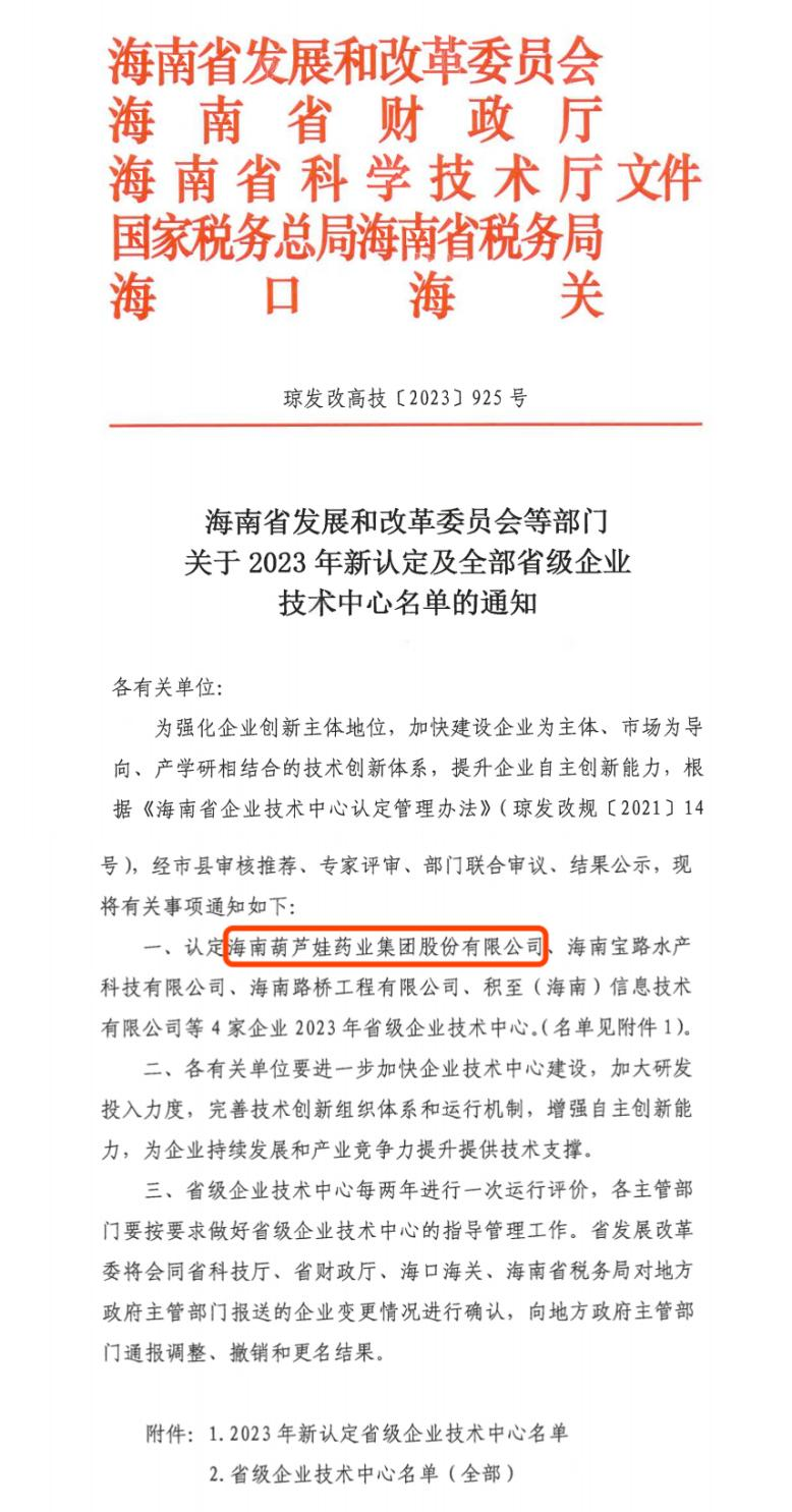 近日,海南省发改委等多部门联合公布了《关于2023年新认定及全部省级企业技术中心名单的通知》,其中,海南伟德国际1946药业集团股份有限公司成功通过评审,被认定为省级企业技术中心,是本次获批的4家企业之一。